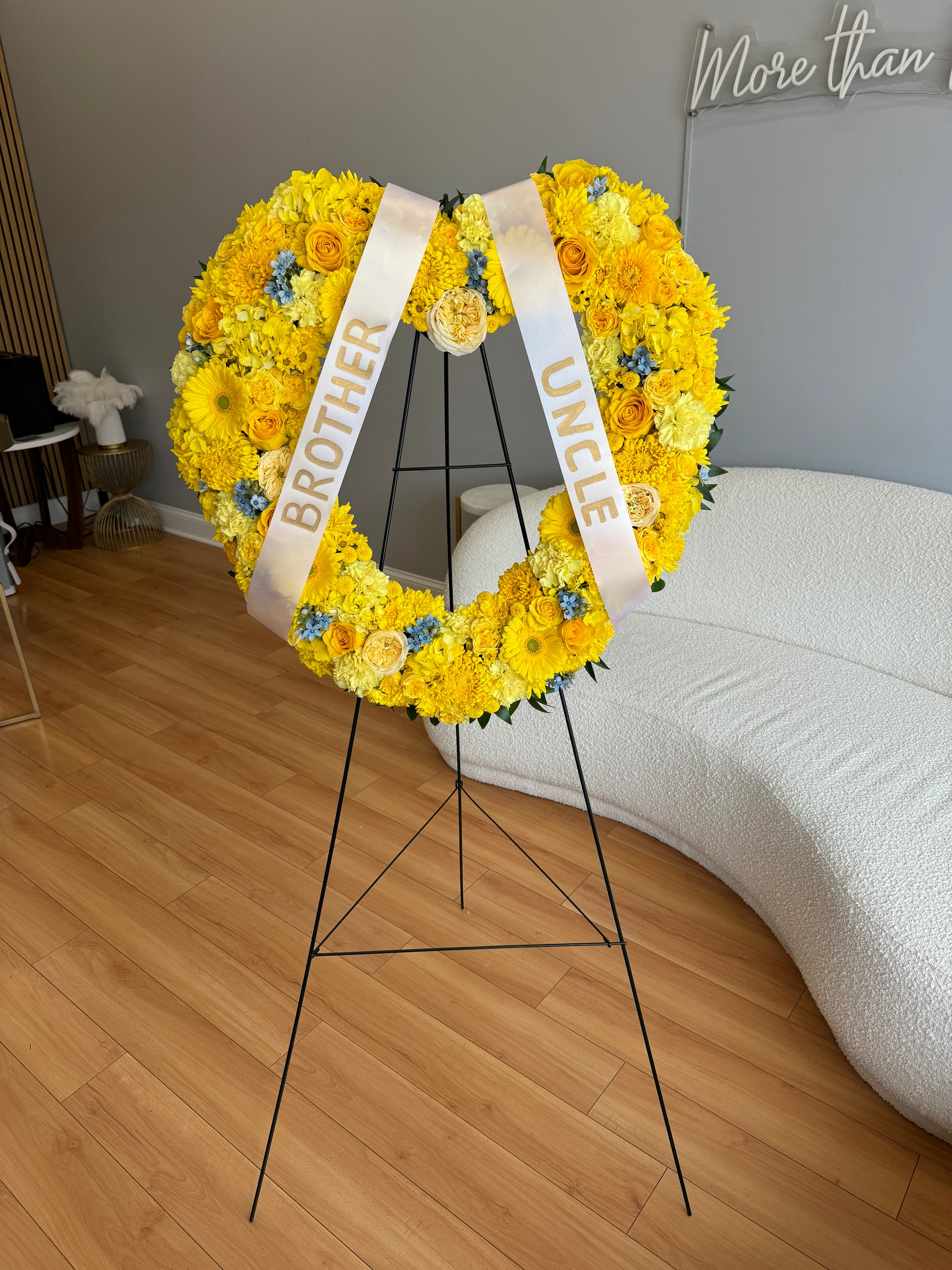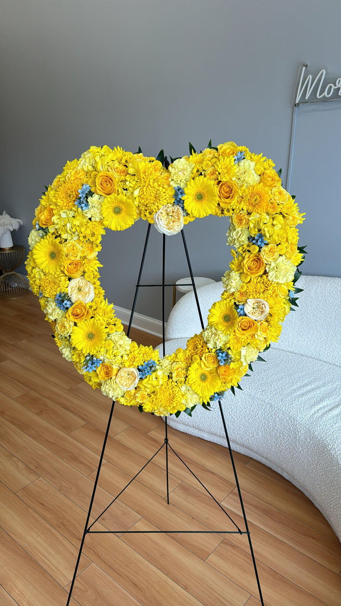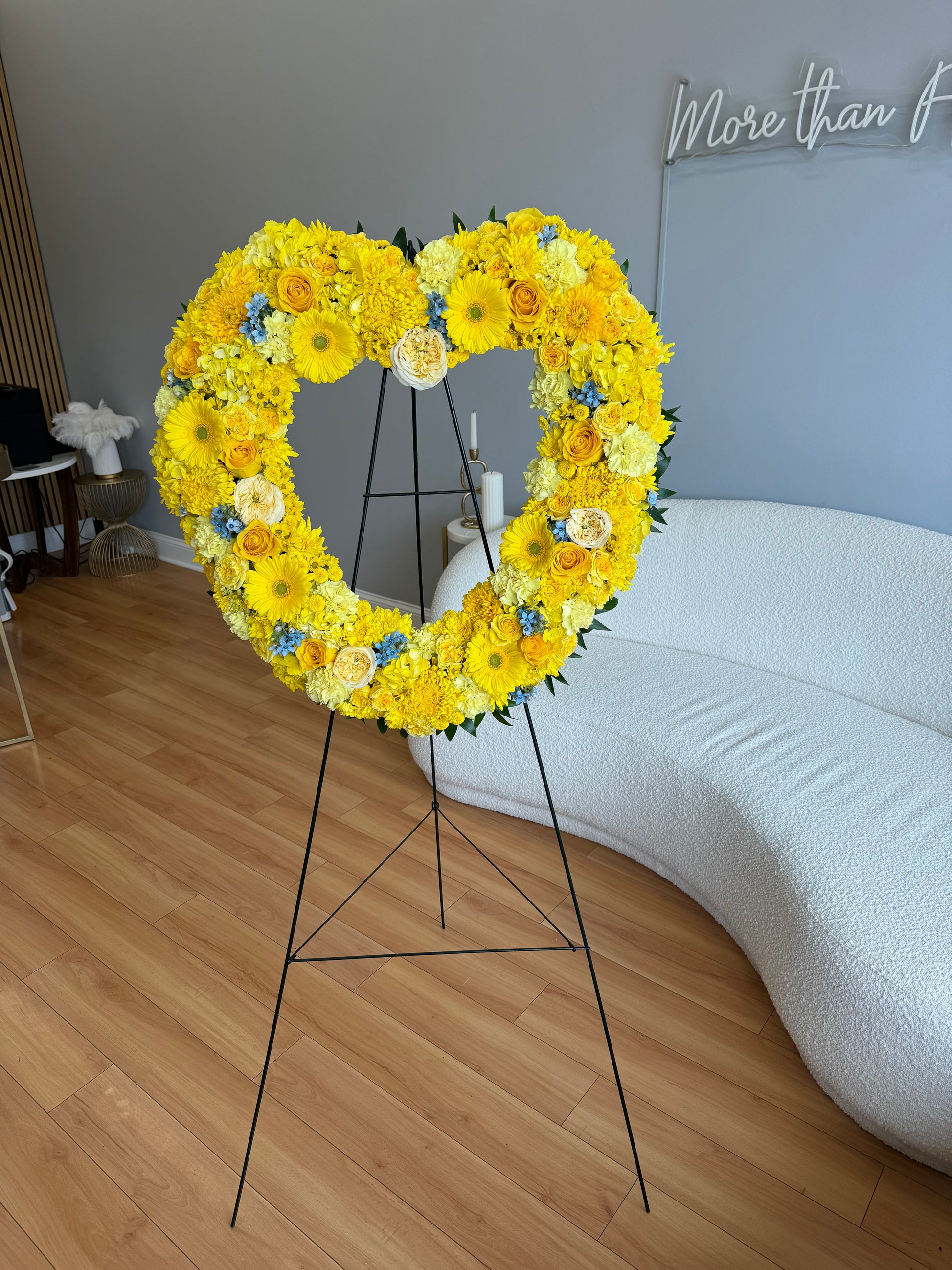 Radiant and full of warmth, Golden Heart shines with vibrant yellow roses, cheerful gerberas, and soft blue accents — symbolizing hope, light, and everlasting love. This heart-shaped arrangement brings comfort and positivity, celebrating a bright spirit that continues to live on in cherished memories.