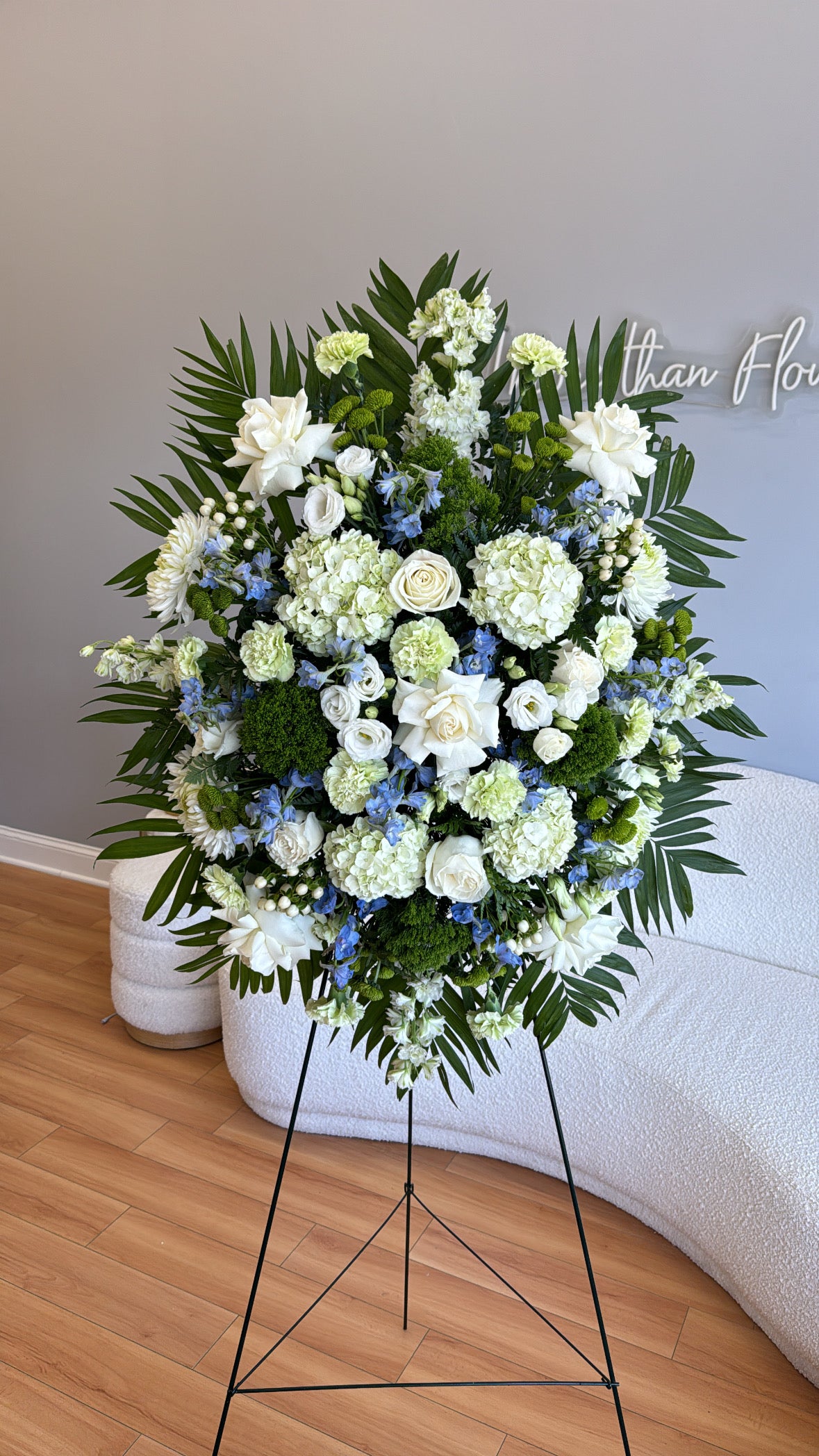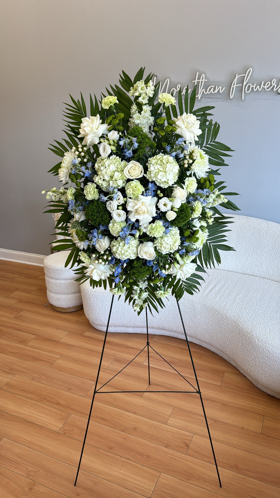 Graceful and soothing, Peaceful Reflections conveys heartfelt sympathy with a soft blend of white roses, hydrangeas, carnations, and gentle blue accents surrounded by lush greenery. This elegant standing arrangement symbolizes peace, comfort, and remembrance — a touching tribute to honor a beautiful life.