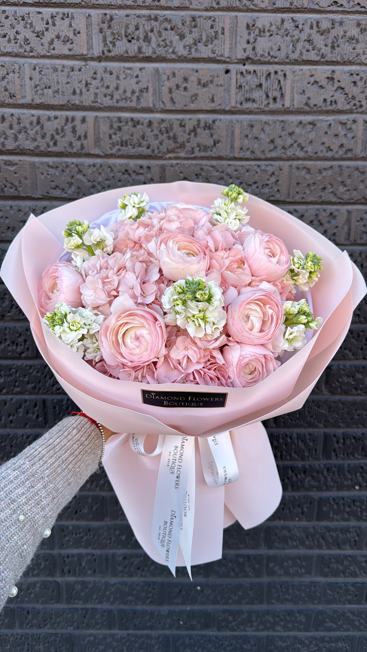Soft, airy, and elegant — Rosé Cloud captures the beauty of a gentle blush sky at sunset. This bouquet features layers of pastel ranunculus, fluffy hydrangeas, and creamy white stock accents, all wrapped in delicate pink for a refined, romantic touch. Ideal for birthdays, anniversaries, or simply to brighten someone’s day, it’s a dreamy expression of love and grace, handcrafted by Diamond Flowers Boutique.
